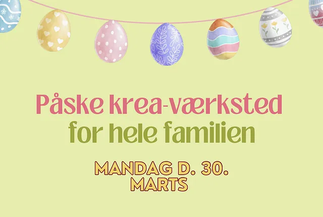 Vi finder masser af kreative materialer frem, så børn og voksne kan lave deres helt egne påske-kreationer, som selvfølgelig kan komme med hjem og pynte.