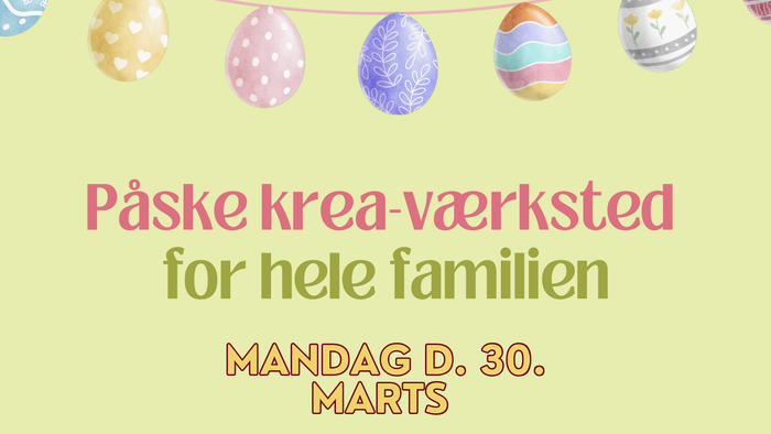 Vi finder masser af kreative materialer frem, så børn og voksne kan lave deres helt egne påske-kreationer, som selvfølgelig kan komme med hjem og pynte.