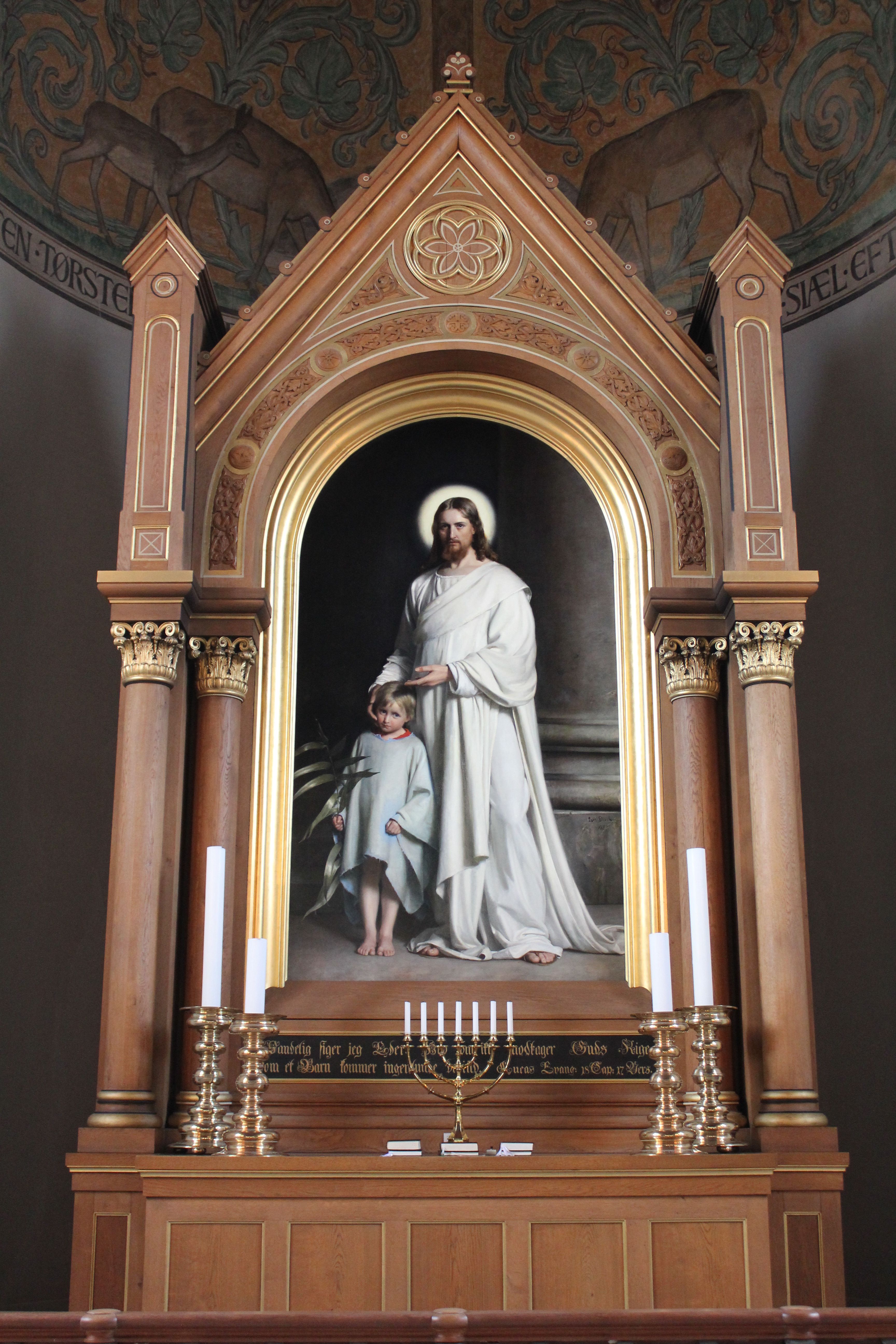 Indenfor finder du blandt andet det stemningsfulde alterbillede "Jesus og barnet", malet af Carl Bloch, og smukke glasmalerier med bibelske motiver, givet af menigheden selv i årene efter Anden Verdenskrig. Frescoen over alteret viser to hjorte, der drikker ved korsets fod – et symbol på livets kilde og håb.